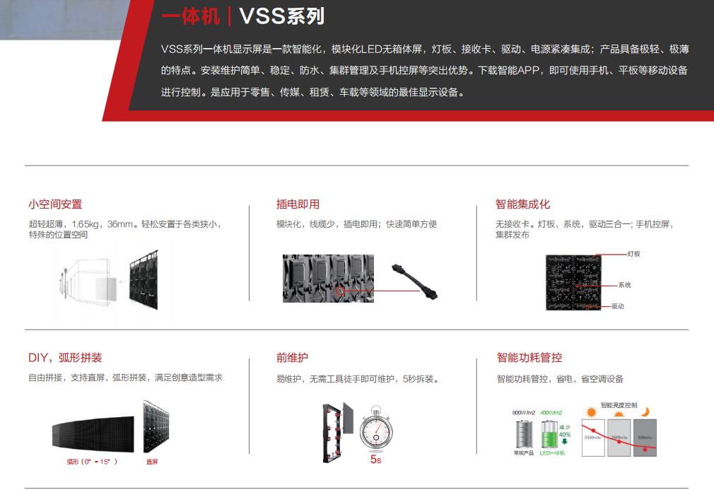 一体机显示屏VSS系列是一款智能化,模块化LED无箱体屏,灯板、接收卡、驱动、电源紧凑集成;产品具备极轻、极薄的特点。安装维护简单、稳定、防水、集群管理及手机控屏等突出优势。下载智能APP,即可使用手机、平板等移动设备进行控制。是应用于零售、传媒、租赁、车载等领域的最佳显示设备。