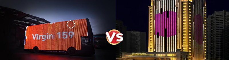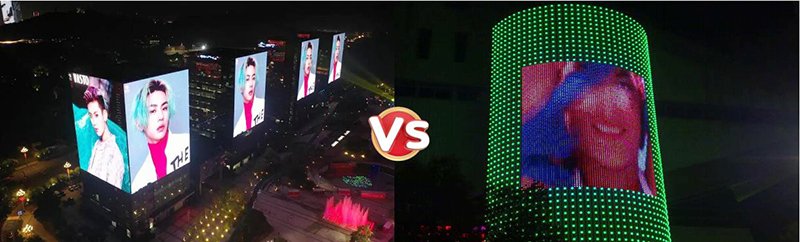 乐天使从事LED显示屏产品已经有20年历史了,实力雄厚,产品质量过硬。那么我们的LED共形屏跟传统LED点光源、洗墙灯有哪些区别呢,可以从一下几个方面对比: